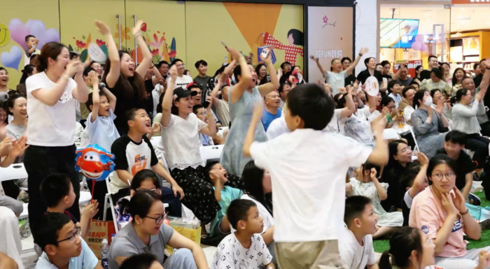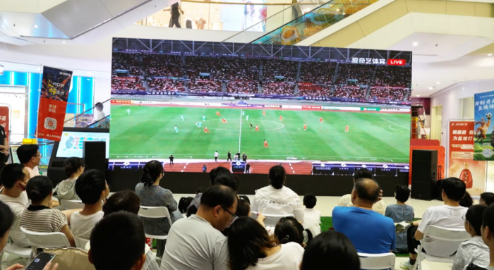 6月28日,鹽都萬達廣場的一樓中庭化作沸騰的綠茵戰場,300平方米的超清巨幕上清晰展現球員們的每一次拼搶、每一腳射門,現場座無虛席,球迷們目不轉睛緊盯賽況。隨著比賽進入白熱化,助威聲、歡呼聲如浪潮翻涌,沉浸式觀賽體驗將賽場的熱血與激情完美復刻。